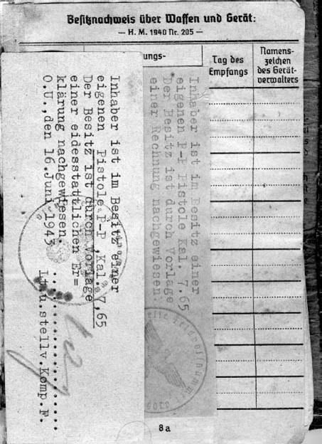 Иногда военнослужащим разрешали носить своё собственное оружие вместо стандартных образцов. На фото вкладыш Soldbuch указывающий, что оружие принадлежит самому военнослужащему, а не армии