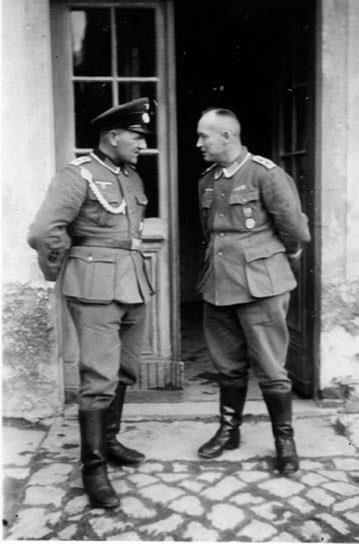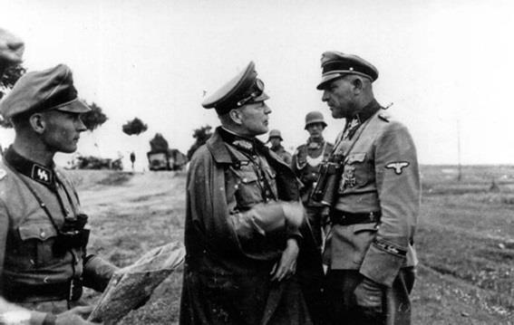 Довольно часто фельджандармы обеспечивали безопасность командиров высокого ранга. Встреча генерал-оберста Эвальда фон Клейста (Ewald von Kleist) и группенфюрера СС «Зеппа» Дитриха (‘Sepp’ Dietrich). Обратите внимание на фельджандармов на заднем плане. (Clyde R. Davis)