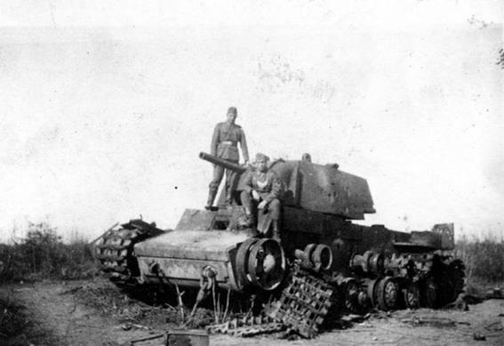 Два жандарма у подбитого советского танка КВ-1.