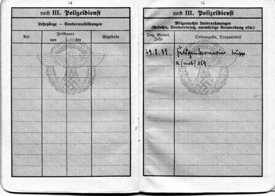 Запись в Polizei Dienstpass Вальтера Тронье (Walter Tronnier) о его временной службе в качестве фельджандарма во время оккупации Судетской области (Sudetenland). Вторая запись о постоянной службе в составе полевой жандармерии уже после начала войны.