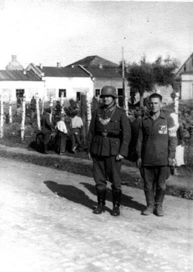 Фельджандарм сопровождает советского военнопленного. Нашивка Kgf на гимнастерке расшифровывается как ‘Kriegsgefangener’ (Военнопленный). (Henner Lindlar)