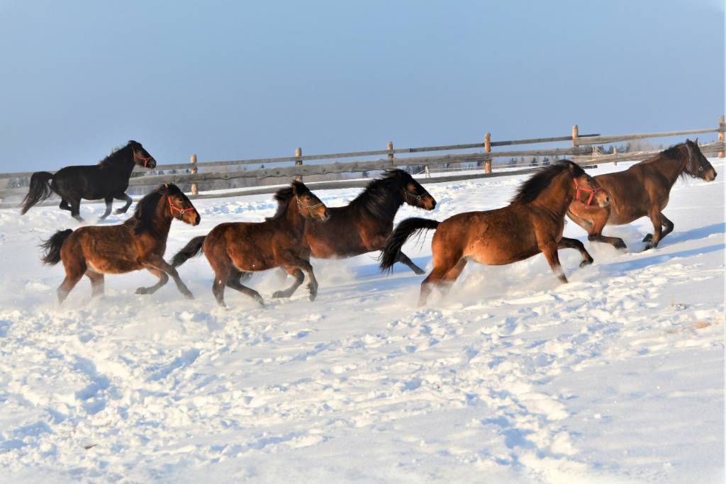 А на видеозаписях из деревни лошади были намного грубее сложенными, меньше ростом и светлее – рыжие и гнедые кобылы бегают в загоне на фоне заснеженного леса.