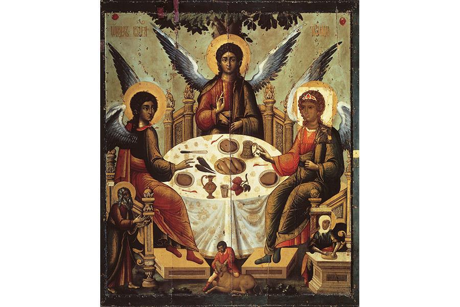 Пример обратной перспективы. Акцент ставится на заднем плане, бесконечно удаленные от зрителя фигуры становятся бесконечно большими. Троица, середина 14 века.