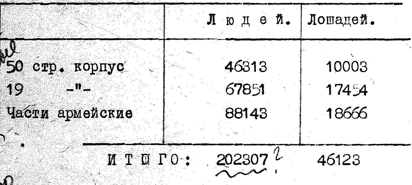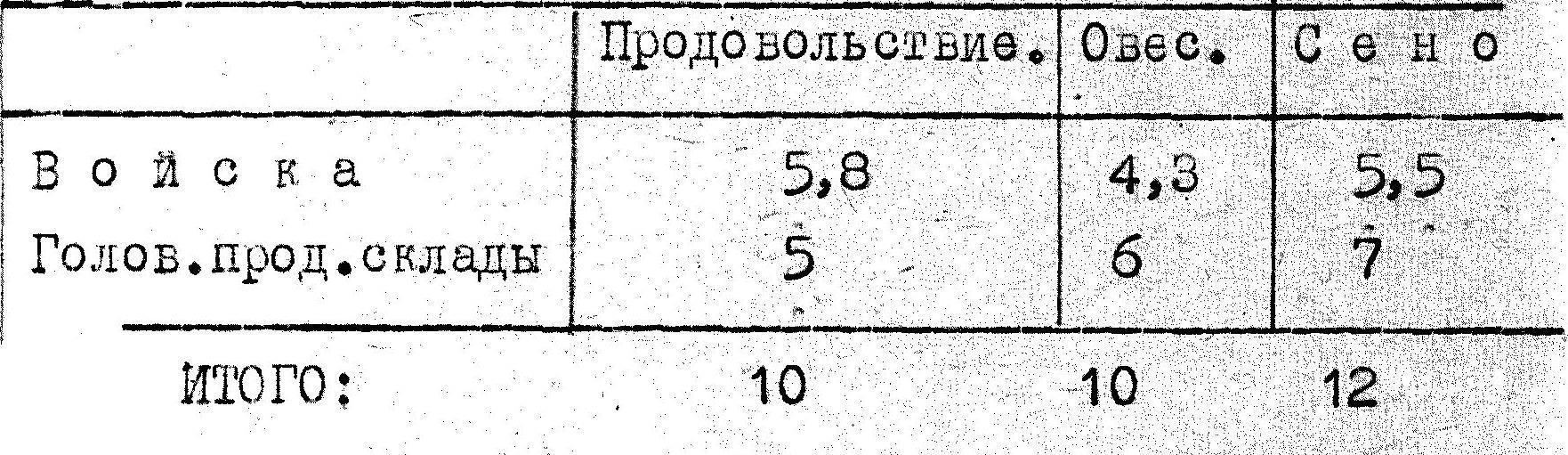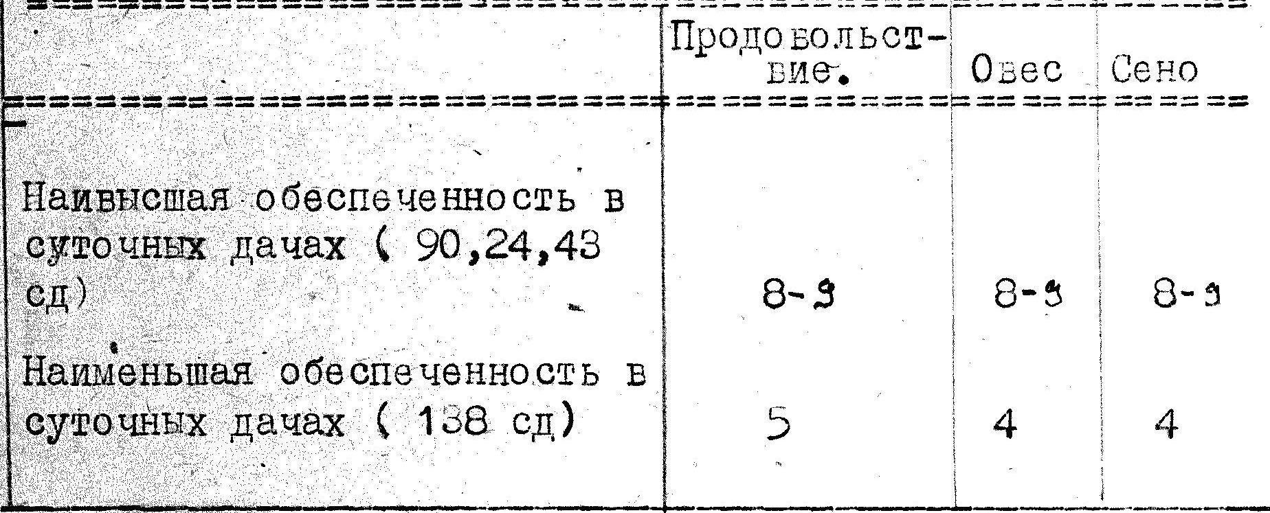 Таким образом в целом по армии войска имели полностью носимые и возимые запасы продовольствия, недостаток 0,7 сутдачи овса и излишек 2,5 дач сена.