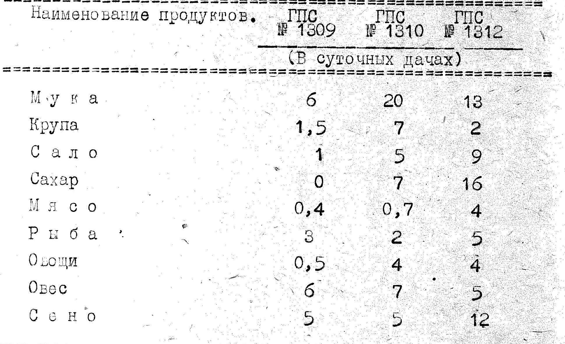 Неравномерное обеспечение складов приводило к тому, что в ГПС № 1309, который обеспечивал 50 стрелковый корпус, к началу военных действий не было вовсе сахару, сухарей, а мяса и овощей имелось только 1/2 суточной дачи.