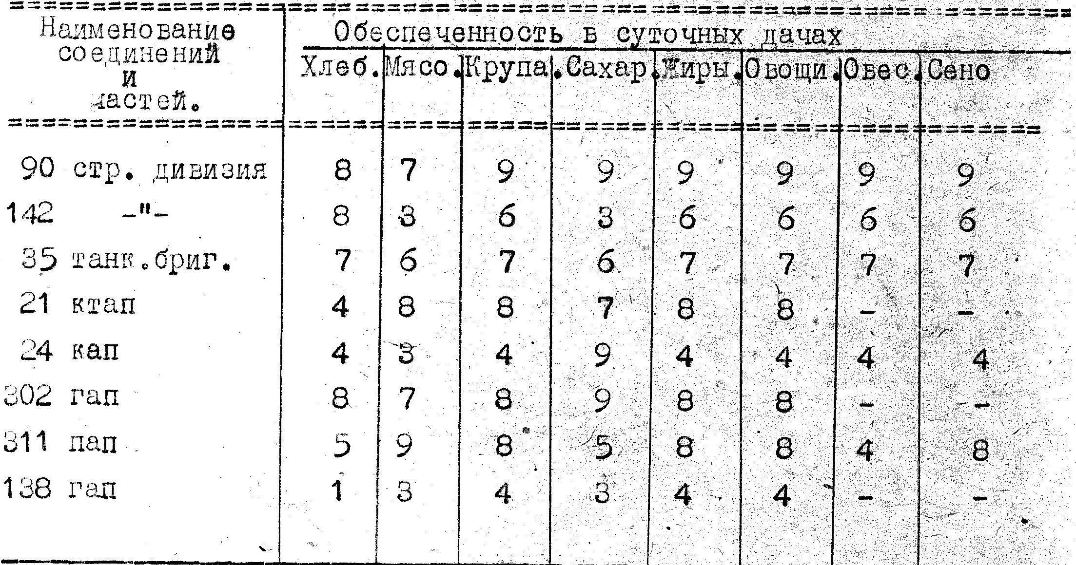 Обеспеченность войск к 18.00 30 ноября 1939 года продовольствием и фуражом была следующая (в суточных дачах):
