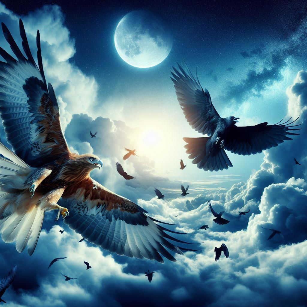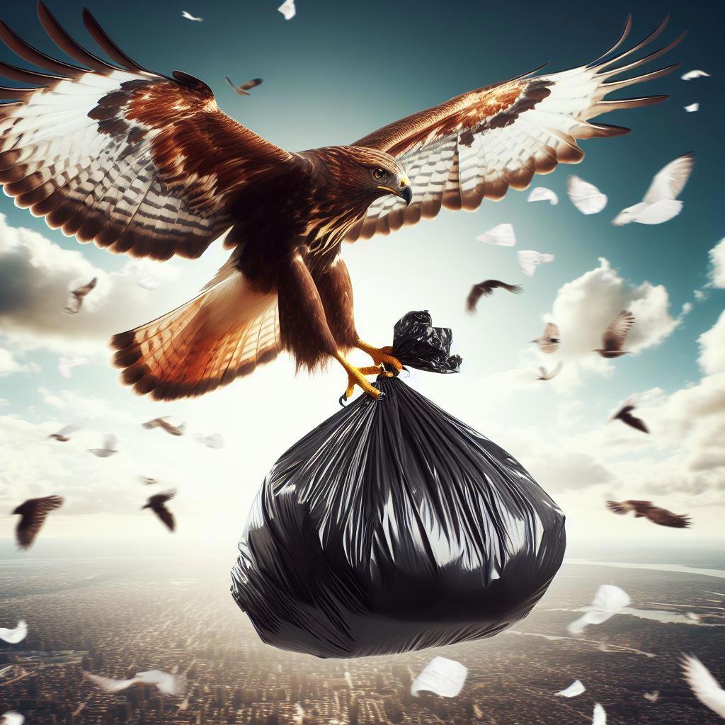 И вскоре мешок оказался до краёв заполненным: обрывками бумаги, фантиками, пластиком и только небо знает – чем еще. Каждая птичка, на зеленой поляне, принесла в своем клюве что-то шуршащее и дурно пахнущее.Теперь нужно было доставить этот мешок на мусорный полигон. Как? Никто не знал. Только пожимали клювами и крыльями. Но все обратили внимание, что ворон куда-то полетел. Прошло немного времени, и пока Люч пытался отдышаться после тяжелого труда, Кир вернулся обратно. Но вернулся не один. С горделивым вороном, летел величественный ястреб.