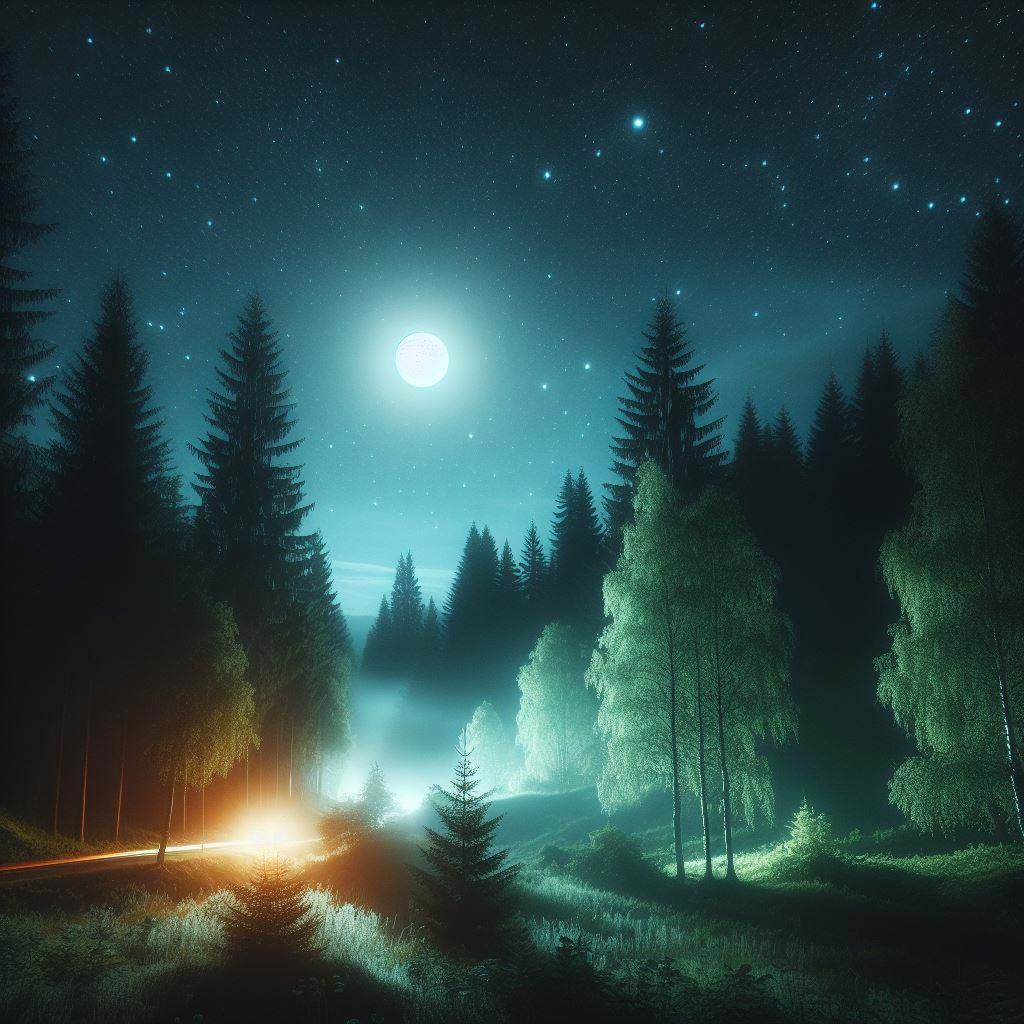 И вот, в какую-то из таких лунных ночей, Люч услышал громкие звуки. Они доносились из того самого места, где он обнаружил чудищ и золу. Звуки были страшными, громкими, скрипучими. Набравшись храбрости и громко выдохнув, потихоньку Люч выбрался из норки, чтобы посмотреть, что происходит. Это было большое зарево, освещающее ночью всю-всю полянку. А иногда, в лучах этого зарева, мелькали странные силуэты, похожие на осенние деревья, когда те утрачивали листву. «Мне кажется, это похоже на голые стволы деревьев, у которых всего по две ветки и появились ноги», - подумал маленький ёж, рассматривая незнакомых чудищ.