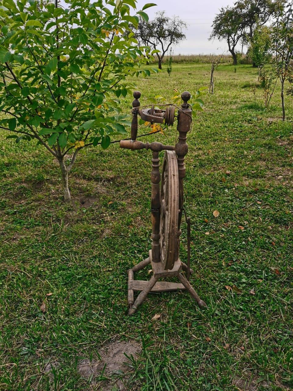 Ткацкие станки в моей семье не сохранились, или я просто не знаю об этом. А вот одна самопрялка до сих пор стоит в деревне, правда, я не знаю, в рабочем ли она состоянии. Такая прялка более поздняя. Ее колесо приводилось в движение нажатием ногой на подножку.