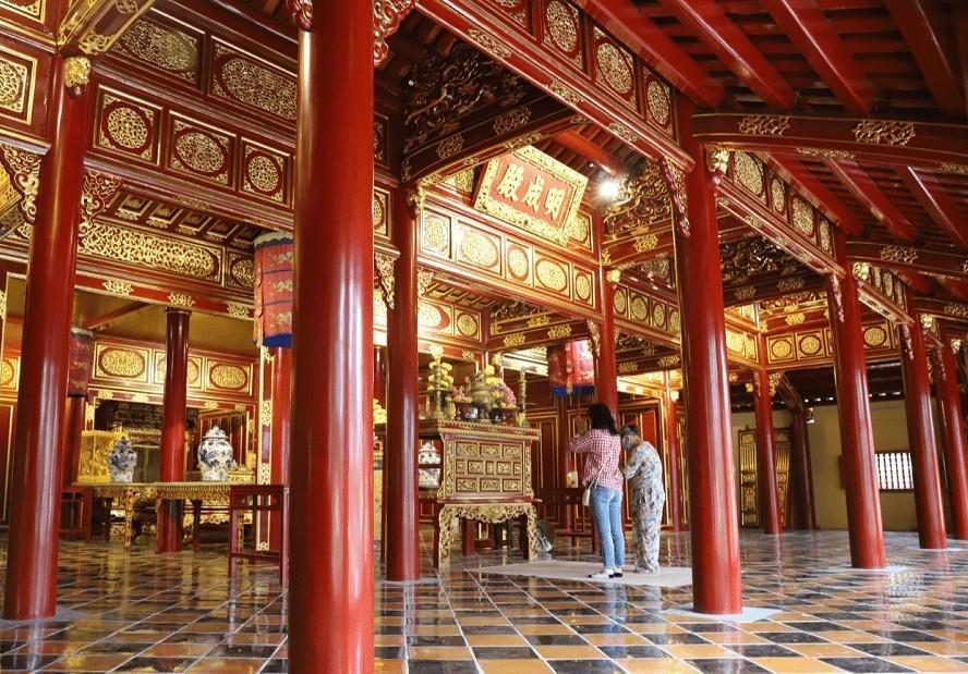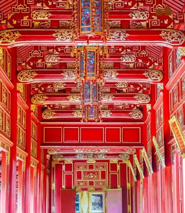Мы входим в роскошный дворец Тай Хоа, тронную палату императоров Нгуен, украшенную лесом мощных ядовито-красных колонн. Каждую пару колонн соединяет перемычка, расписанная золотом. Проход между колоннами ведет к императорскому трону. Количество золота и невероятно сложная роспись поражают; впрочем, на это и рассчитывали создатели Тай Хоа.