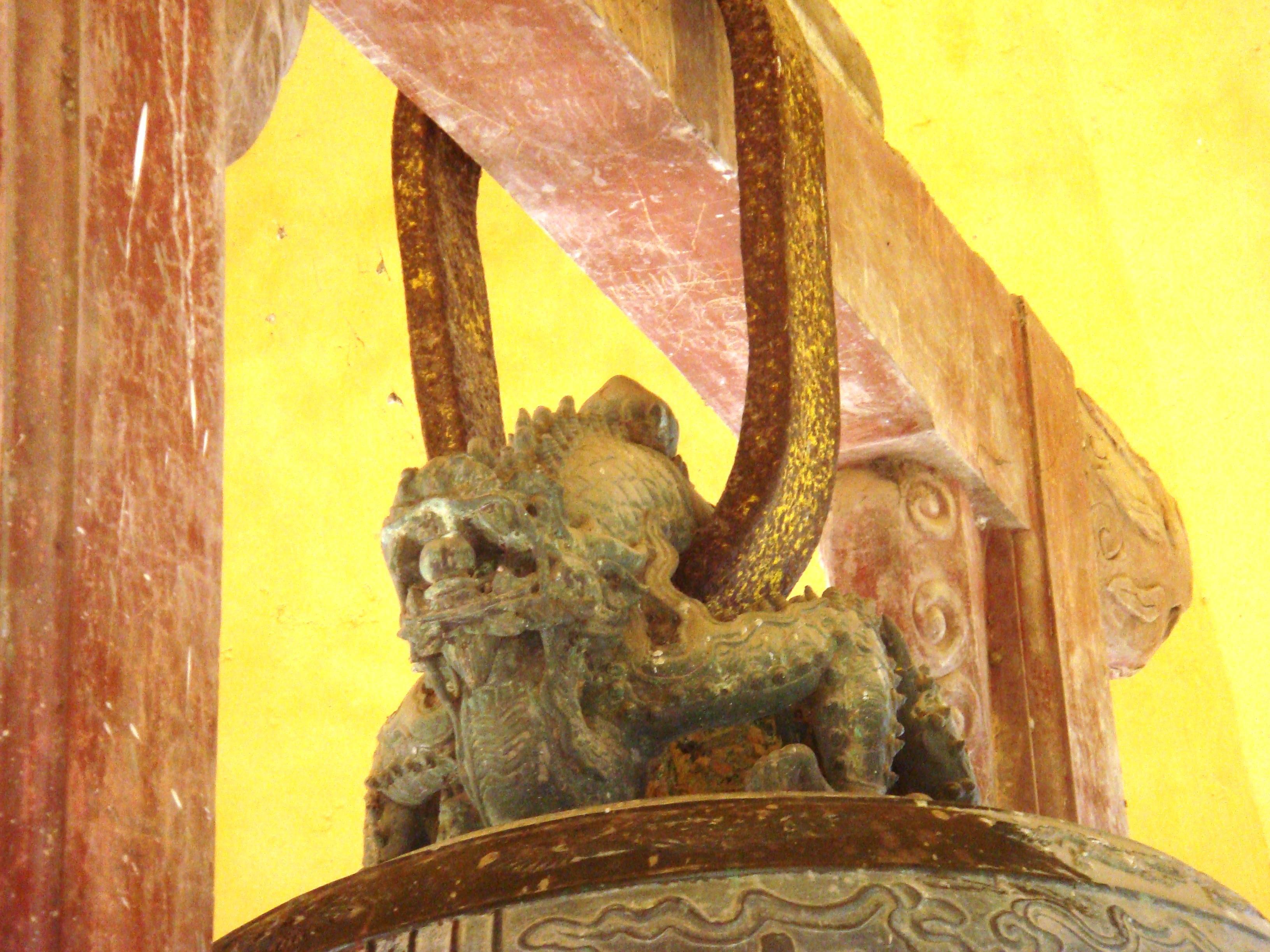 Мы карабкаемся по ступеням полуметровой высоты к пагоде. Небольшой монастырь позади нее обучает молодых монахов искусству бития в гаргантюанского размера бронзовый колокол весом в две тонны – низкий вибрирующий звук колокола слышен в радиусе десятка километров, как утверждает Нге... Но, разумеется, их основное предназначение – служение духу Девы Небесной, которой и посвящен сам монастырь.