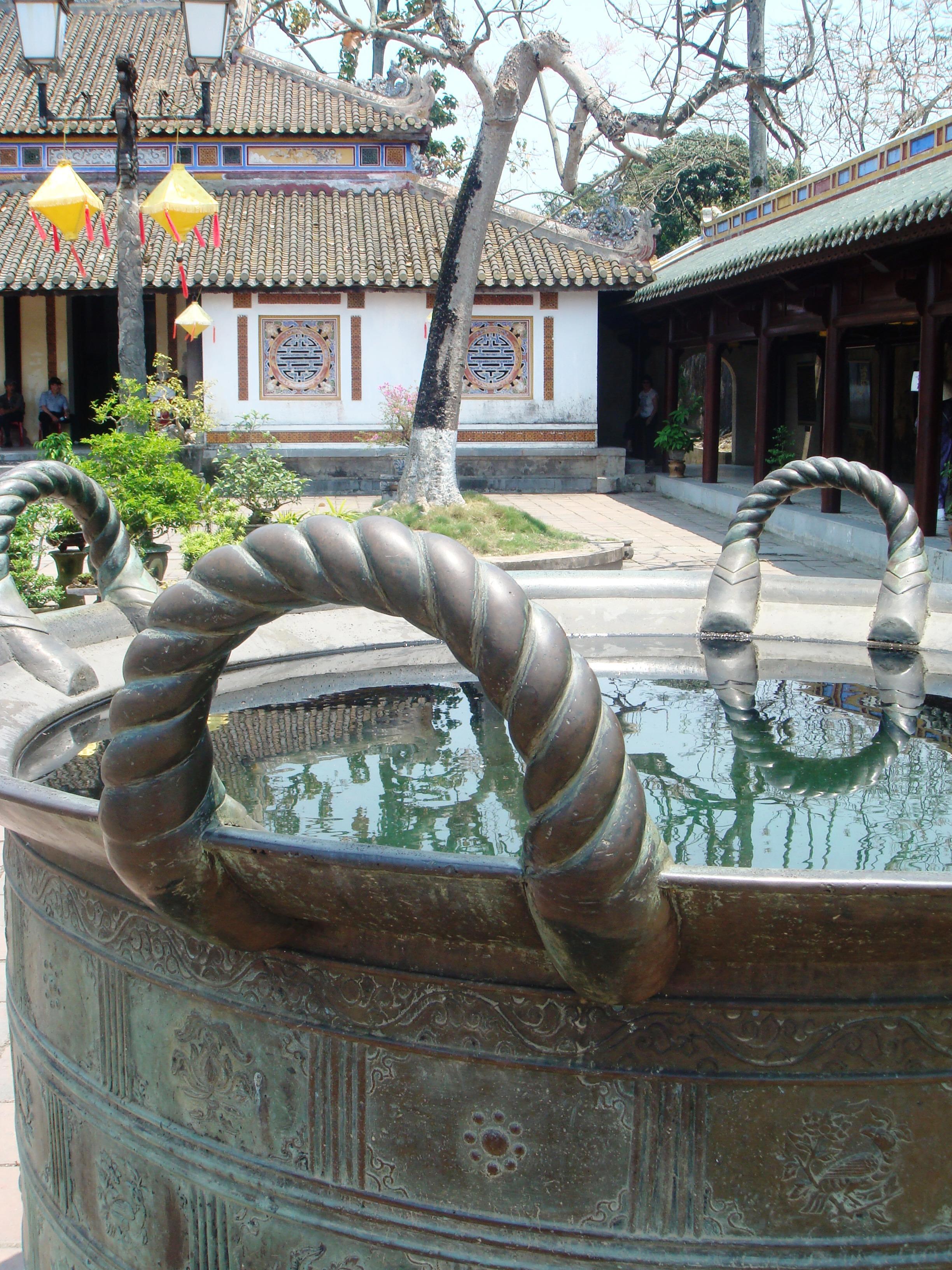 Выхожу на свежий (если его можно так назвать) воздух. Немного забавляют два огромных, в три куба, не меньше, бронзовых чана с витиеватой чеканкой на боках. Они по-прежнему стоят перед приемными покоями, один – у павильона для гражданских мандаринов, другой – у военно-мандаринского павильона. Наверное, в них очистительно-символично купали вельмож до того, как они представали пред светлыя очи императора. Разноцветные драконы на коньках обветшалых крыш кивают нам рогатыми головами в мареве жары. Театр и библиотека в Пурпурном Городе Цитадели были сильно повреждены во время "Тет-инициативы", кровавой и яростной страницы в истории американской войны, как и многие другие исторические памятники Хюэ.