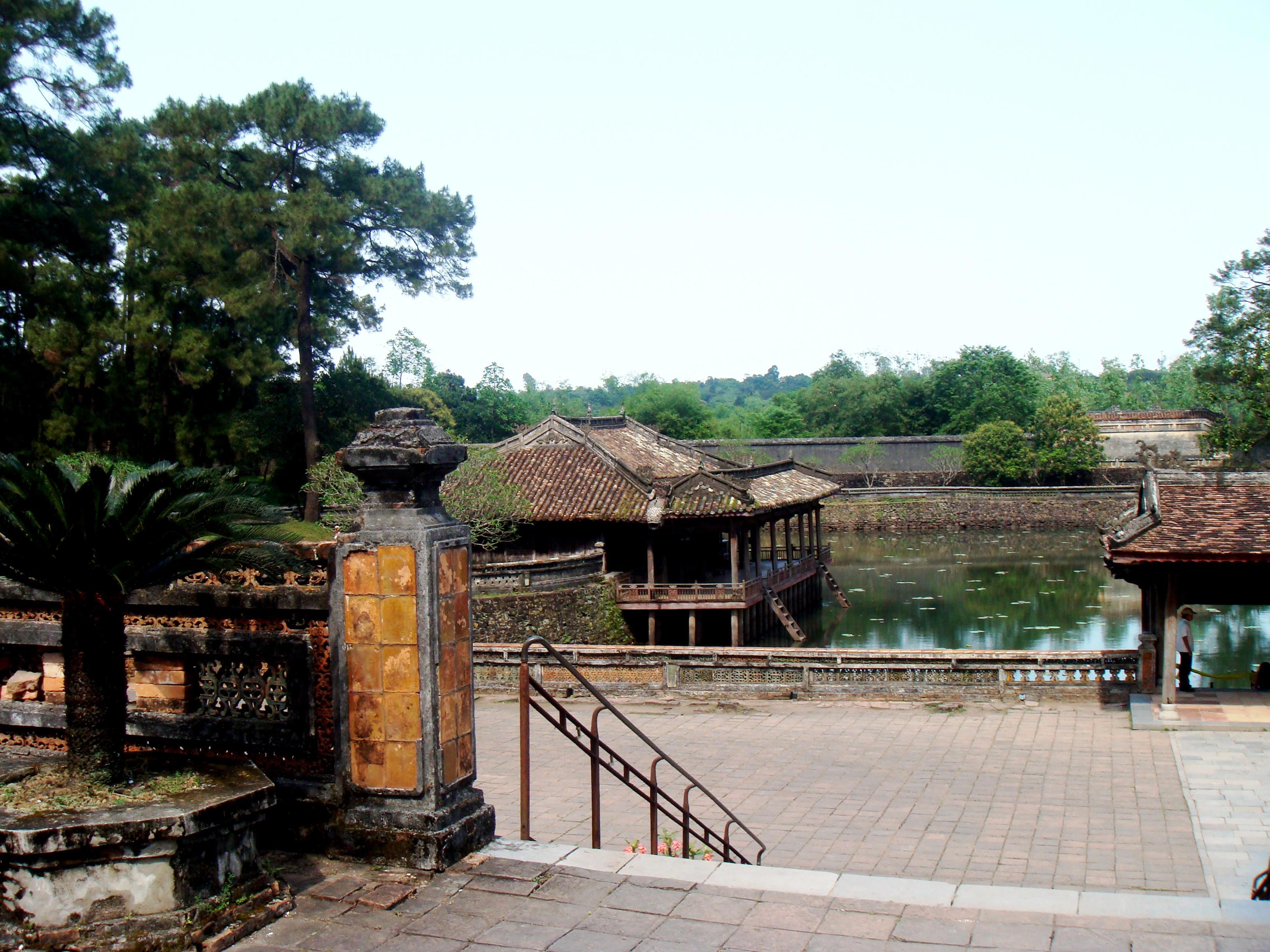Время прощаться с Цитаделью. Избежав последние атаки "вандала"-торговок (чудодейственная мазь из печени змеи, веера-шляпки и пр.), мы втискиваемся в заскорузлые коконы сидений вьетно-автобуса, в котором совсем нет места для среднестатистических европейских и американских коленок. Мы едем теперь в мавзолей-усыпальницу императора Ту Дук. Вьетамские императоры династии Нгуен соревновались между собой в качестве и богатстве подготовки перехода в лучший мир – примерно в том же ключе, как и египетские фараоны – поэтому их мавзолеи представляют из себя настоящие города-сады размером в несколько гектаров, с великолепными комплексами искусственных рек, озер, гор (ну, холмов...), храмов, дворцов и, естественно, усыпальниц, в которых, помимо виновников торжества, покоились их любимые родственники, жены, конкубины, советники и слуги. Император Ту Дук любил свой мавзолей куда больше, чем дворец в Цитадели Хюэ и проводил там все свободное время. (Он так же любил и качественно поесть: история гласит, что на каждую трапезу он требовал 50 блюд, приготовленных 50-ю поварами и поданных 50-ю же слугами...)