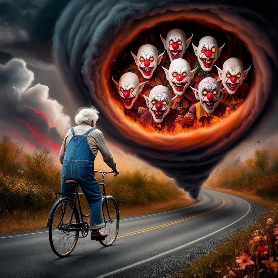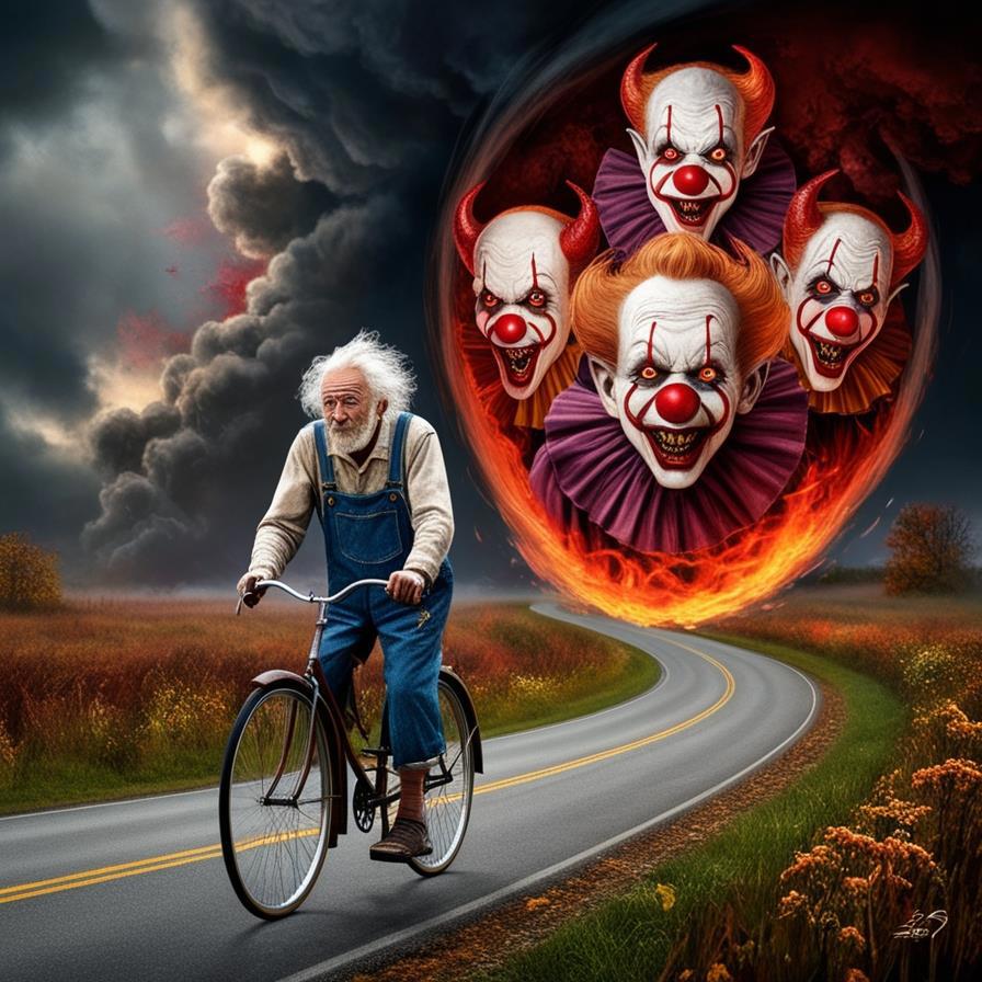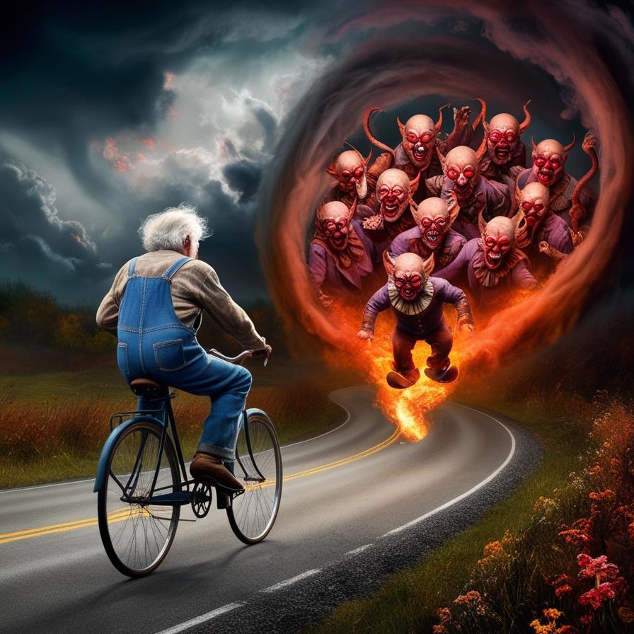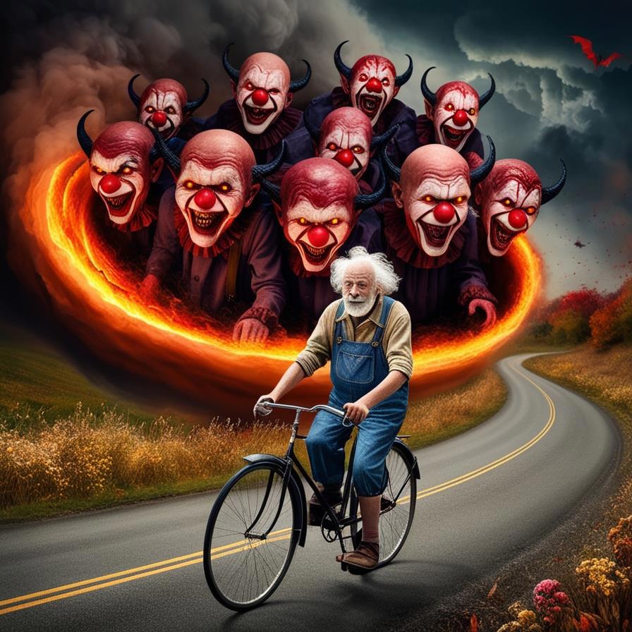 Демон завыл, высокая скрипичная нота перешла в дикий срежет металла, загалдели адские клоуны. Мир завертелся, закружился, старика подхватило потоком и замотало в темном водовороте, тьма затягивала его вместе с удочками, велосипедом и ведром полным воды.