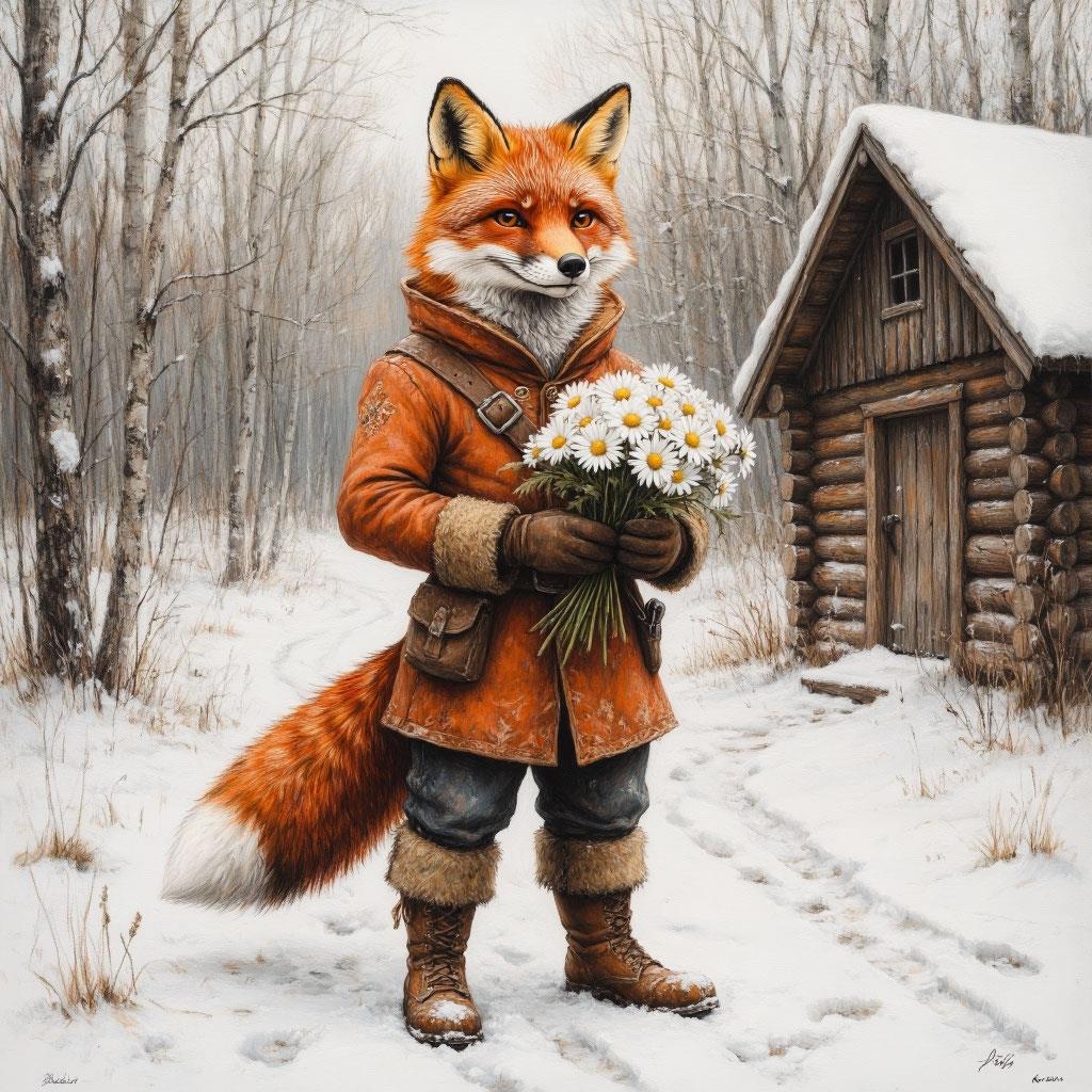Лис повиновался и через мгновение вернулся с ведёрком, в котором белел пушистый легкий снег. Кабан, глядя на такую покорность, только фыркнул, но рыжий плут и бровью не повел: растопил снег на теплой печи, деловито забрал у Лиски букет и пристроил его в талую воду. Затем снял полушубок и подошел к столу поближе.
