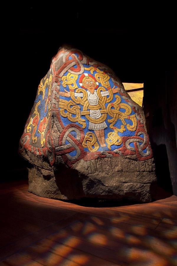А ниже — Эллингский (Дания, X век) камень. Надпись была заказана королём Харальдом Синезубым в честь его отца, короля Горма, в память о том, что он обратил Данию в христианство. И да, это Иисус.