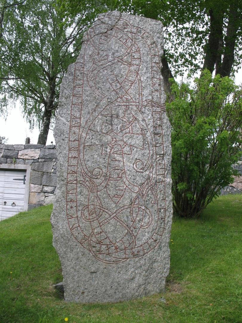 б) Хертруд воздвигла этот камень в память о своём сыне Смиде, добром храбром человеке. Его единокровный (или единоутробный) брат Бранд сидит в Гардах. Резаны (руны) правильно, для любого, кто может интерпретировать.