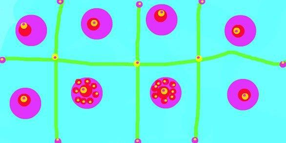 В двух центральных клетках, расположенных внизу, в ядрах находятся дополнительные восемь маленьких кружков, которые могут представлять процесс деления клетки. Эти маленькие кружки являются символами новых ядер, возникающих в результате процесса митоза. Митоз — это биологический процесс, в ходе которого одна клетка делится на две дочерние клетки, каждая из которых содержит копию генетического материала исходной клетки.