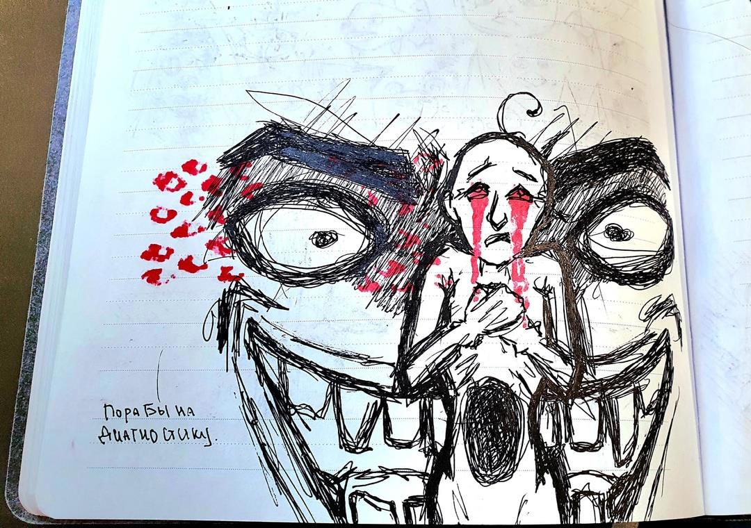 Слова «Пора на диагностику», написанные на картине, звучат как последний призыв о помощи, как последняя надежда на спасение.