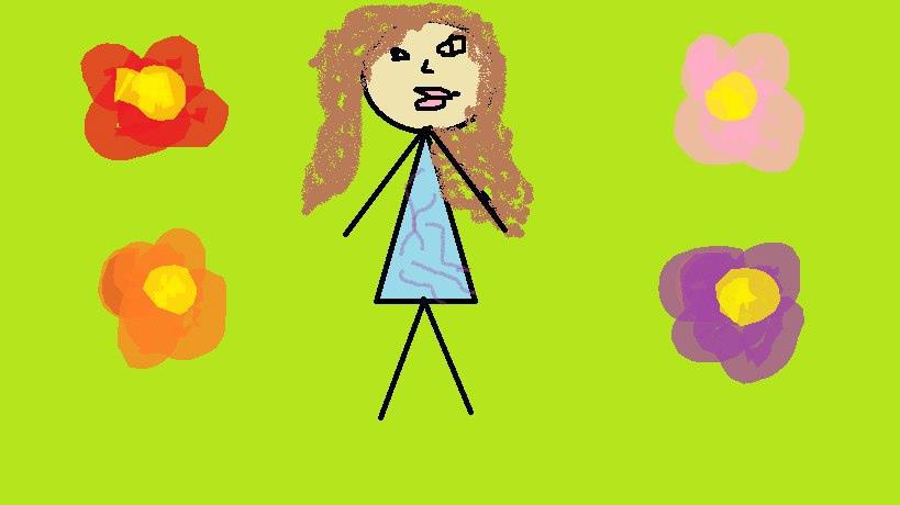 Картина Маринетт Мортем "Девушка и 4 цветка на лугу" представляет собой изображение девушки в центре и четырех цветков по углам.