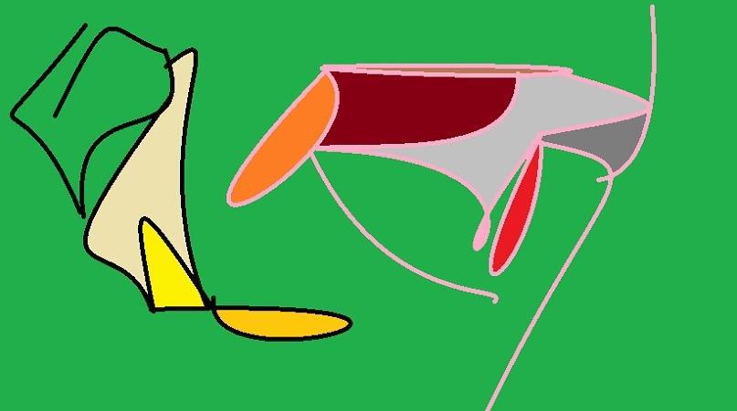 На некотором расстоянии от рояля находится девушка. Платье девушки представлено в виде петли в бежевой заливке, а две желтые петли символизируют ее ноги.