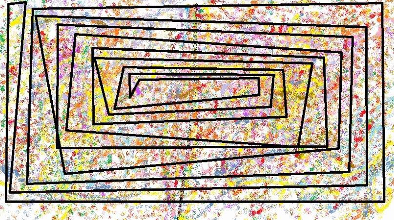Картина Маринетт Мортем "Лабиринт" представляет собой изображение на фоне, выполненном напылением красок разных цветов. Разноцветные мелкие точки образуют фон, на который наложена черная линия, образующая лабиринт.