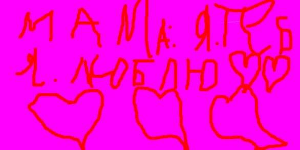 Картина Маринетт Мортем "Мама, я тебя люблю" представляет собой графити, на котором красными корявыми буквами на фоне фуксии написано "МАМА, Я ТЕБЯ ЛЮБЛЮ".