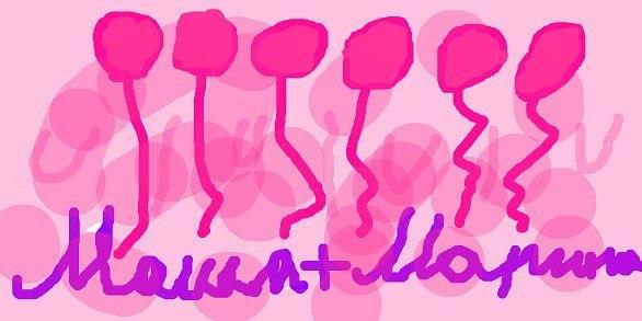 Картина Маринетт Мортем "Маша + Марина" представляет собой изображение на розовом фоне. На фоне расположены шесть розовых шариков, напоминающих чупа-чупсы, на кривых ножках. На фоне есть розовые тени этих шариков, расположенные хаотично, как будто несколько источников света. Маша - это детская подруга Маринетт.