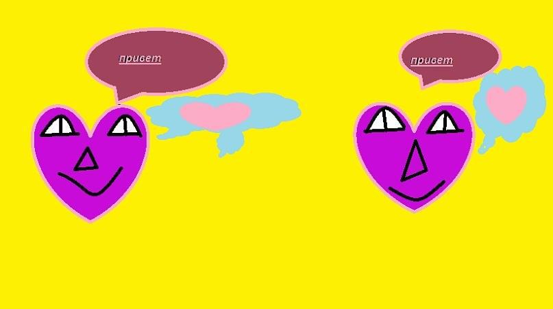 Каждое сердце имеет мысль, отображенную в голубом облаке, и в нем по розовому сердцу. Большие антропоморфные сердца без тел говорят друг другу одно и то же: "привет" и "привет", хотя думают о любви.