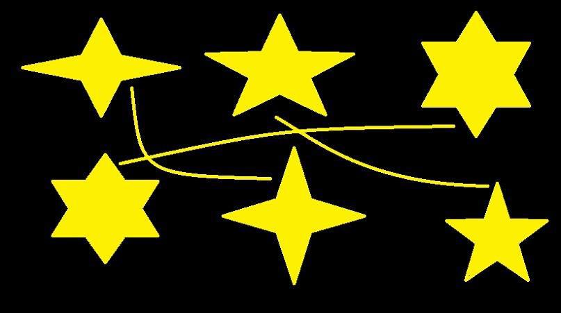 Звезды соединены между собой по две линиями, образуя геометрические фигуры. Звезды имеют одинаковую форму: две четырехконечные, две шестиконечные и две пятиконечные. Они расположены в разных местах, что создает ощущение движения и динамики.