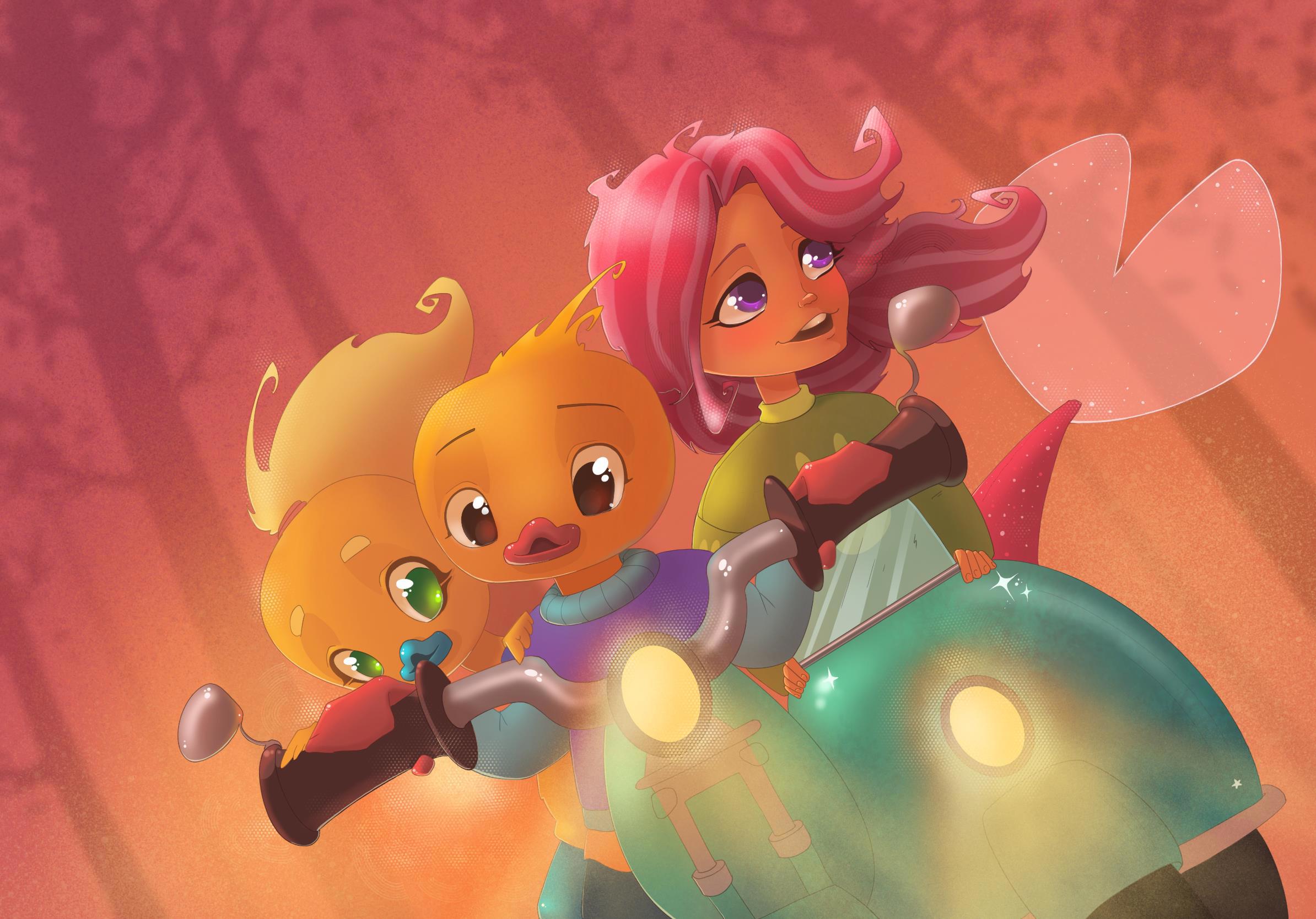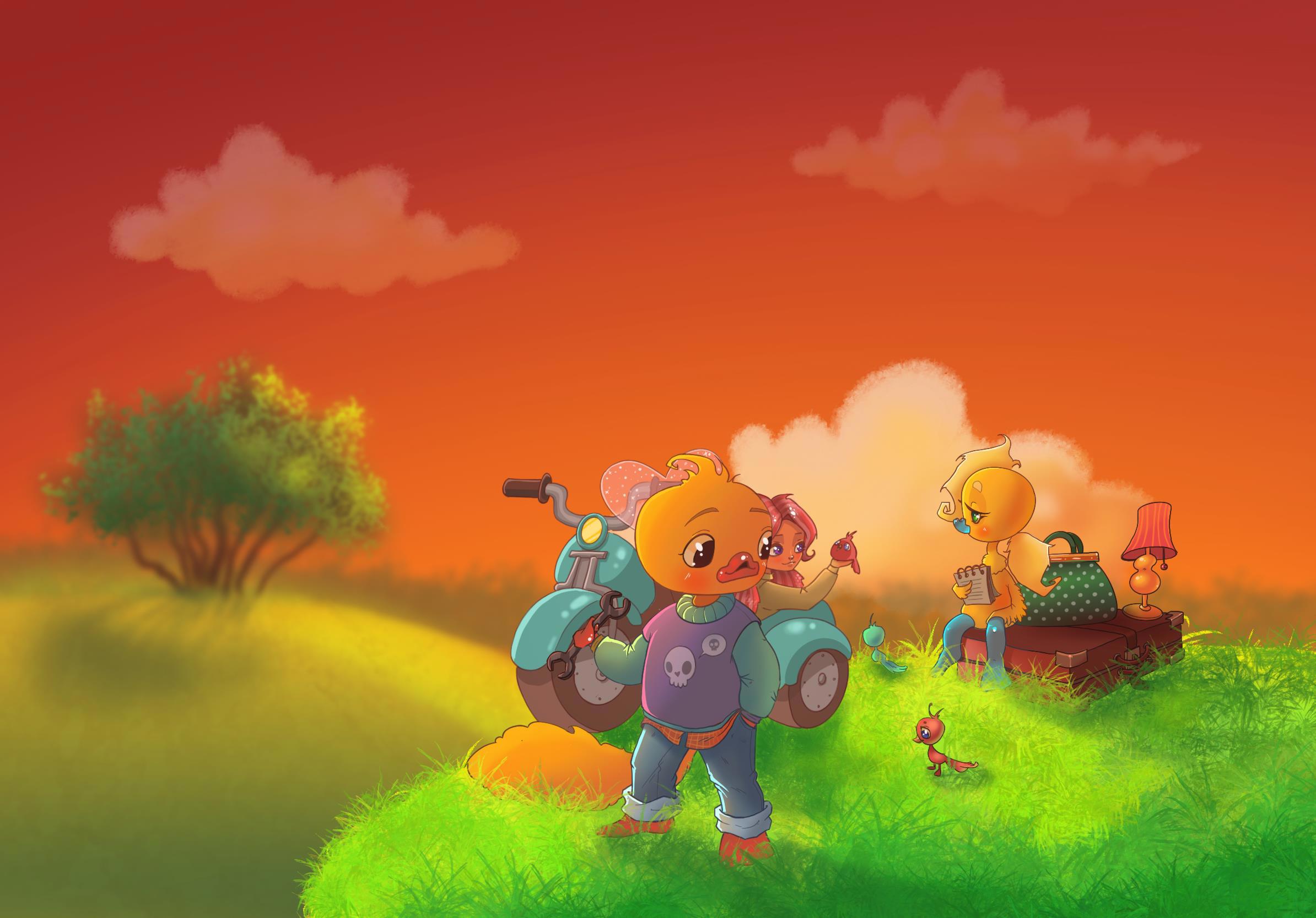 Первым спрыгнул Костя и оценил обстановку: проверил, в каком состоянии Марго — она была в порядке, только вода немного расплескалась, — и помог спешиться Анюте. Пока уточка отцепляла от мотоцикла старую железную тележку, утконос обошёл вокруг и осмотрел повреждения.