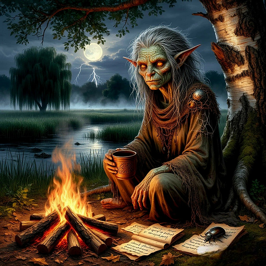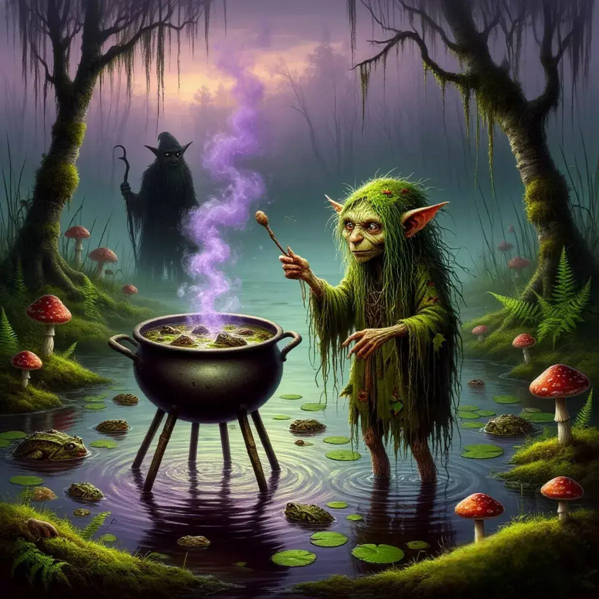 А Болотник — бегом, почти весело, к кромке болота, туда, где над котелком вьётся дымок, где Кикимора, ворча, помешивает ложкой и загадывает, что Леший наконец-то «остепенится»…