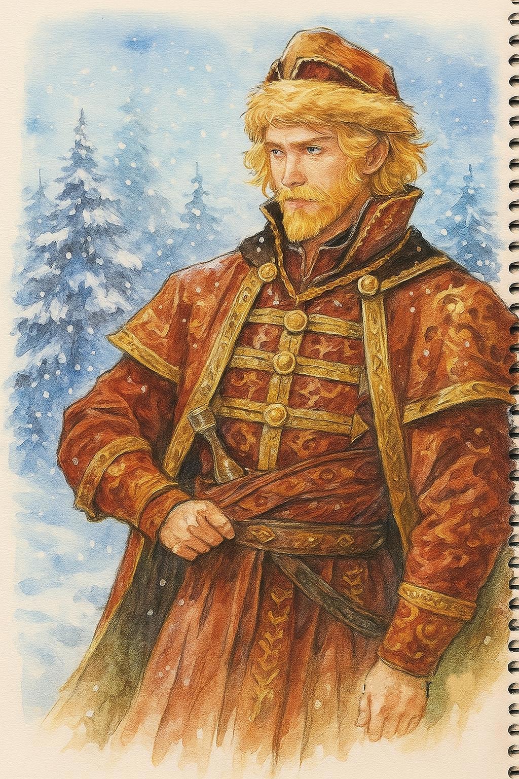 К нему подошёл один из них — высокий, закутанный в чёрный меховой плащ. Длинные чёрные волосы, заплетённые в косу, поблёскивали инеем, словно тонкие нити серебра. Его взгляд то и дело скользил по теням меж деревьев.