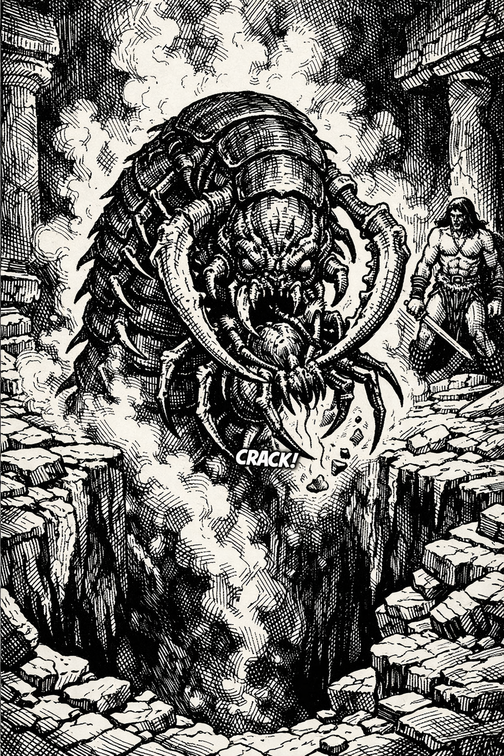 Сколопендра не двинулась. Она молча наблюдала. Чёрная жижа пузырилась на её изломанном панцире, и Конану показалось — он видит, как там начинают проступать новые, только что выросшие пластины, ещё не успевшие отвердеть.