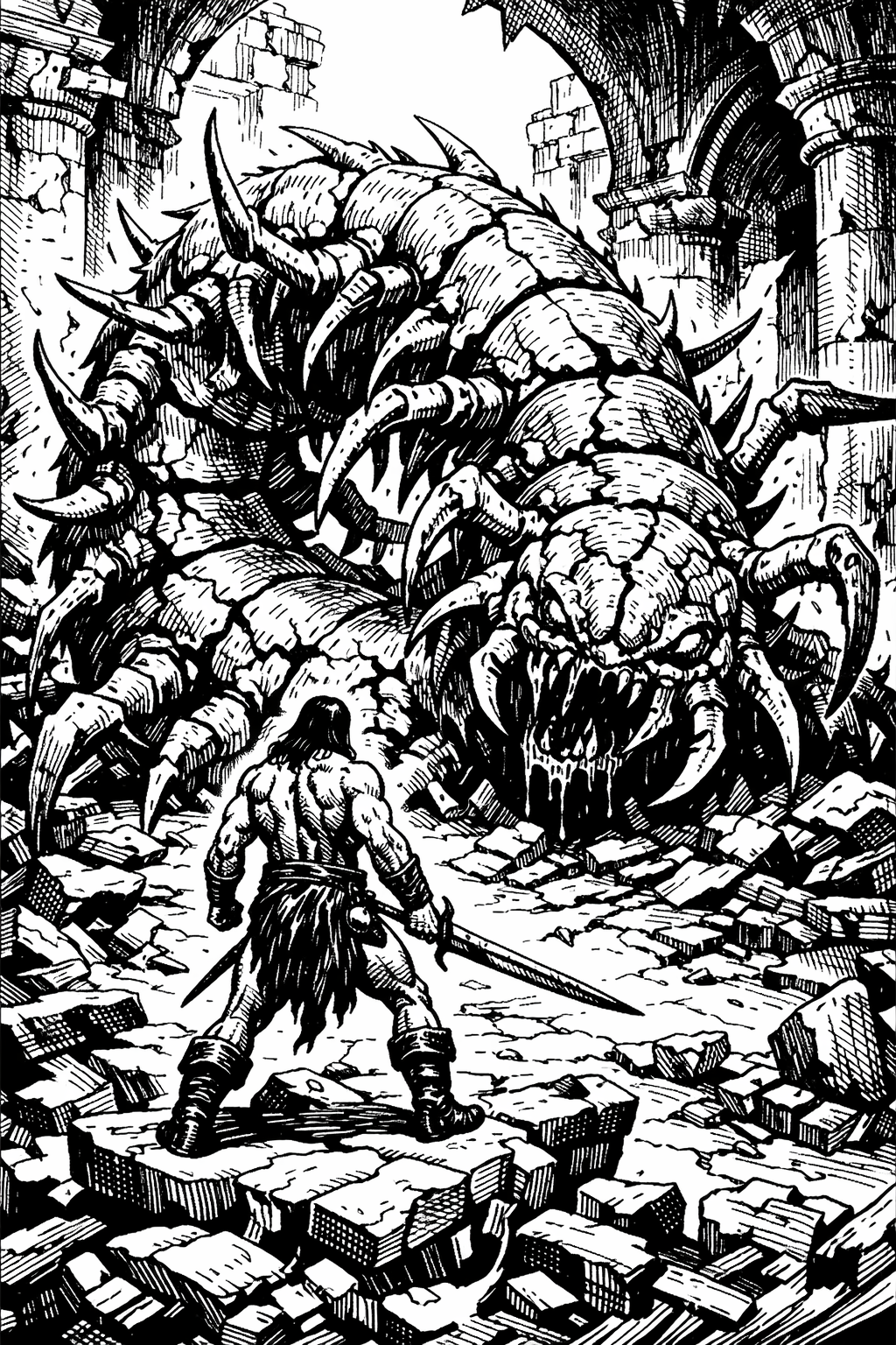 Оно было длинным, многосуставчатым, больше всего похожим на громадную сколопендру, но куда страшнее любой твари, что Конан видел прежде. Каждый сегмент тела был защищён чёрным панцирем, а по бокам уродливой башки торчали хватательные конечности — длинные, с костяными клинками, похожими на серпы богомола.