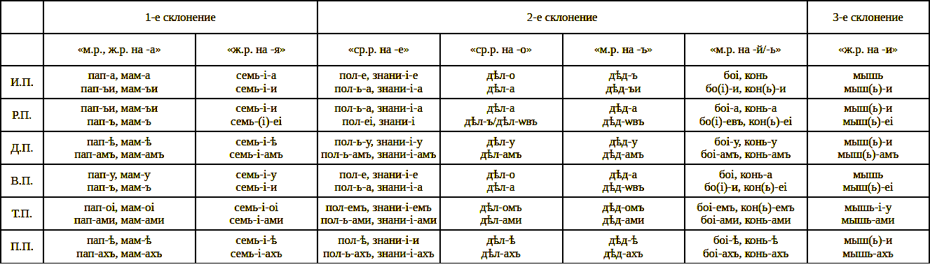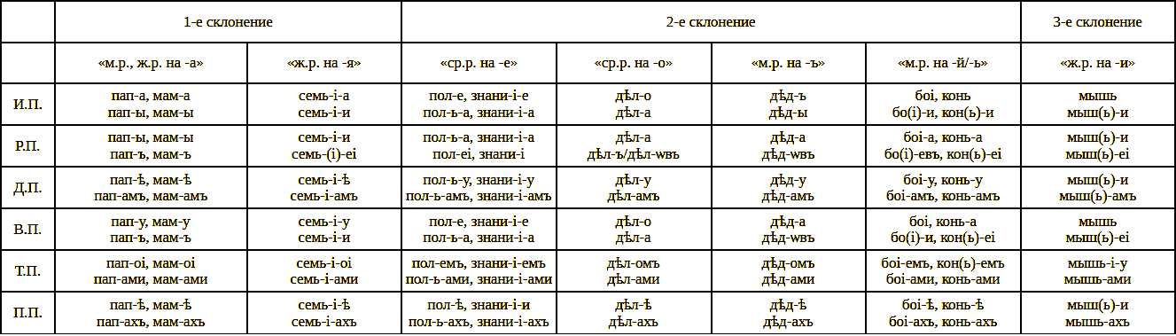 Или вот возьмём в пример существительные; у них выделяют 3 продуктивных склонения, которые можно представить табличкой так: