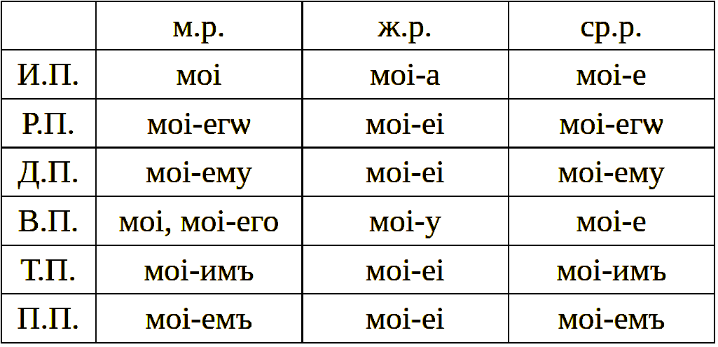 Проиллюстрируем это, просклоняв ранее заявленные местоимения в разных родах: