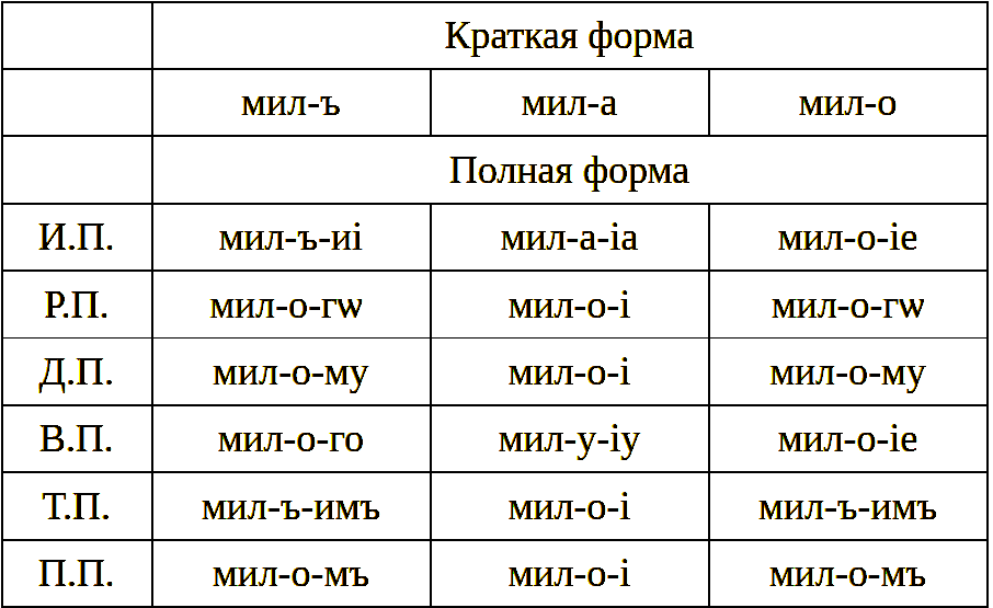 Прилагательные изменялись бы по родам и падежам таким образом: