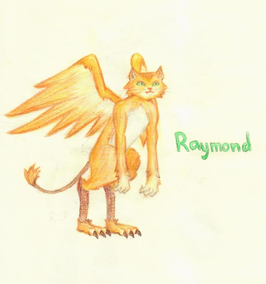 У него и голова и тело кота, крылья орла и хвост льва. Он стоит на задних лапах, которые похожи на лапы грифона, у них голени без шерсти, и большие ступни с тремя огромными когтями на каждой лапе. Передние лапы Реймонда свисают вниз, что придаёт его фигуре ощущение обречённости. Крылья кота-грифона напоминают крылья величественного орла и покрыты густым оперением, которое придаёт им объём и силу. Они пропорциональны телу кота-грифона, и имеют характерный изгиб. Цвет перьев крыльев – тоже рыжий, но может варьироваться до золотистого, как и шерстка этого загадочного кота-химеры.