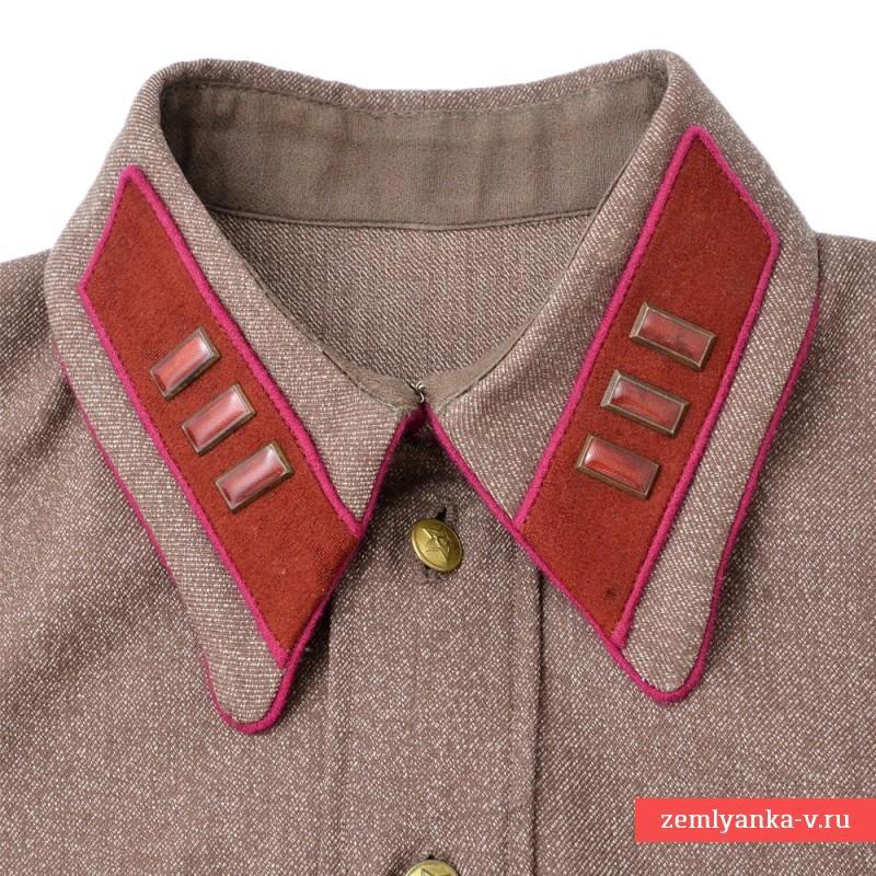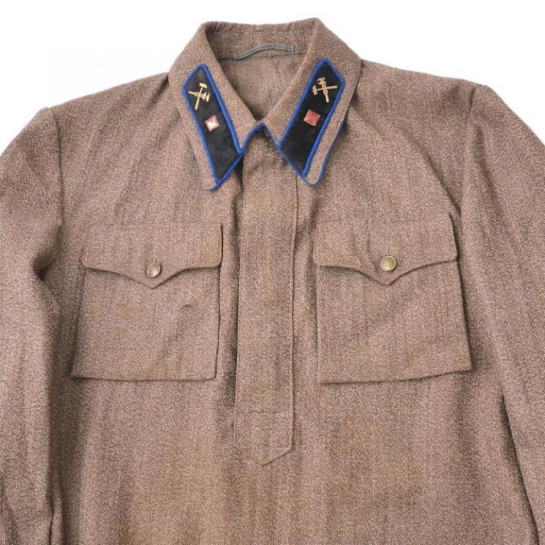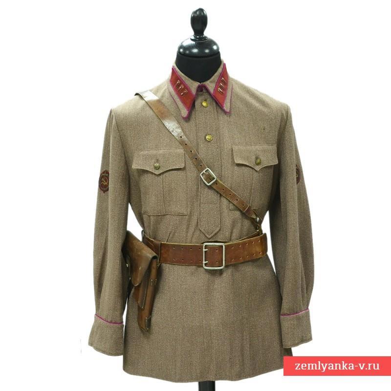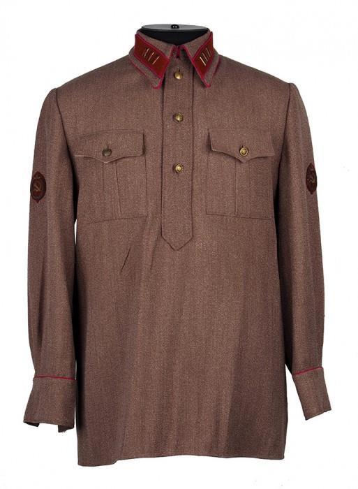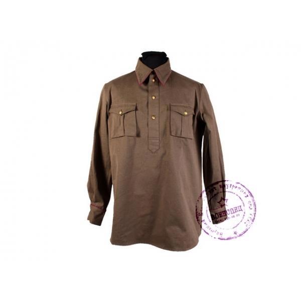 б) гимнастёрка (рубаха) защитного цвета (шерстяная для зимней формы, х/б для летней, хотя это строго не регламентировалось) с отложным воротником (с петлицами крапового цвета с малиновой окантовкой) и вертикальной планкой на пуговицах, нагрудными карманами с клапанами на малых латунных (золочёных) пуговицах и обшлага на двух аналогичных пуговицах, воротник и обшлага с кантами малинового цвета, длина гимнастёрки длиннее обшлагов на 1,5-2 см; На обоих рукавах — нарукавные знаки ГУГБ НКВД СССР. Гимнастёрка носилась только по строевой форме с поясным ремнём или снаряжением; летом допускалось ношение белой гимнастёрки с белой фуражкой; с 1938 г. (как в РККА, а также войсках ВВ НКВД СССР и ПО НКВД СССР) разрешено ношение т. н. «улучшенной» коверкотовой гимнастёрки — в том числе, серо-зеленовато-коричневого, серо-стального и серо-голубого цвета; «улучшенное» обмундирование заказывалось сотрудниками только за свой счёт и стоило не так уж и дёшево.