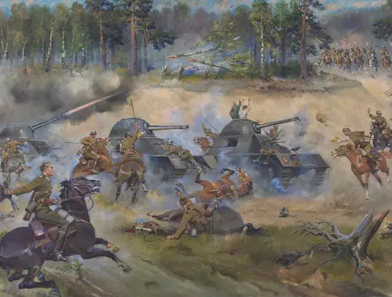 Пафосно превозмогая усилия островитян и галлов по защите Польши, тевтонцы в очередной раз продемонстрировали свой знаменитый блицкриг. И буквально первого сентября произошёл первый бой лыцарей против панзеров. Так как орднунг превыше всего, лишь только наступило обеденное время семьдесят шестой пехотный немецкий полк присел кушать сосиски и запивать пивом. Видимо привлечённые запахом алкоголя и провианта, на них набрели уланы из восемнадцатого померанского полка, а так как фрицы делиться не захотели, то порубили их бравые поляки в лохмотья. Шляхтичам на беду недалеко паслись два немецких пулемётных бронеавтомобиля, которые и наказали мародёров. Именно про эту историю страшно любил потом рассказывать герр Гудериан, какие мол славяне тупые, с кавалерией против танков.