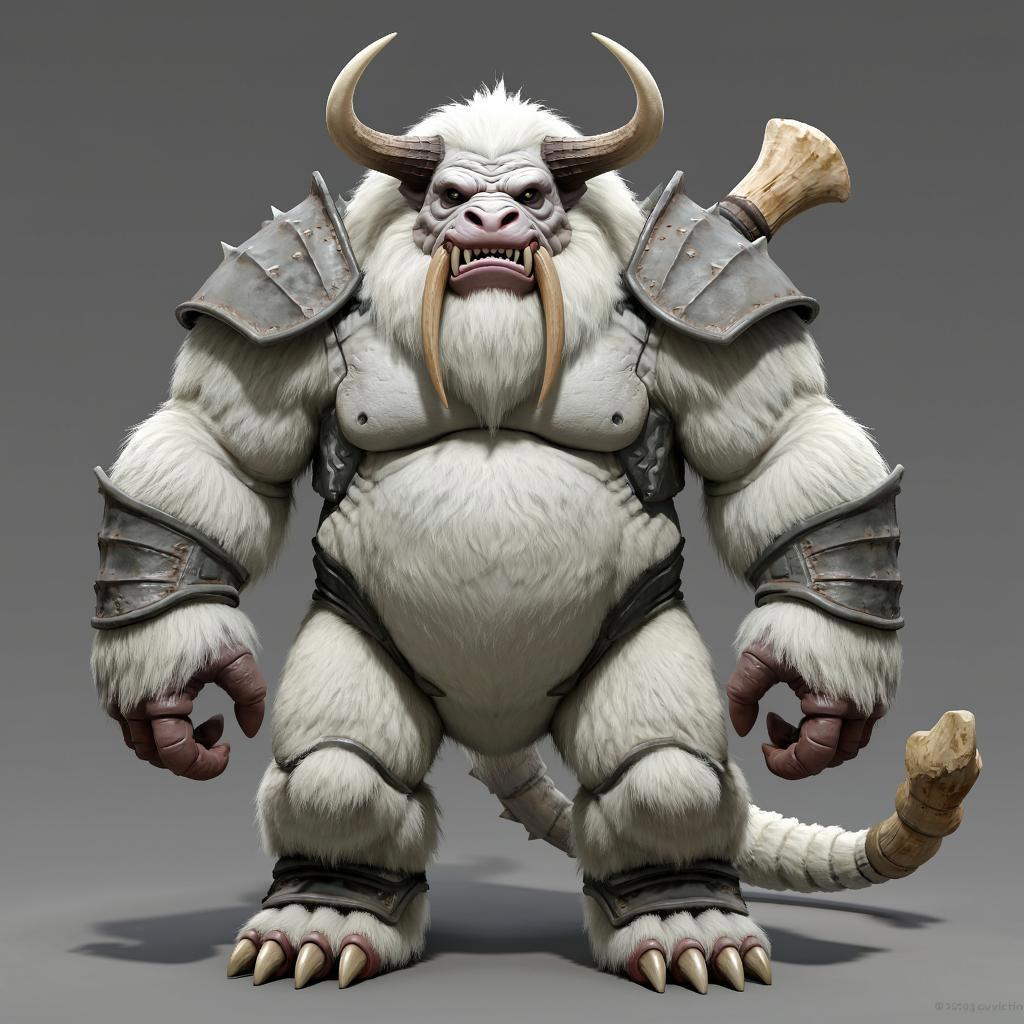 Белая шерсть покрывала толстую кожу на руках, ногах, местами на груди, в области паха и шеи. Голова была низко посажена, так, что виднелись бугры мышц на спине. Из макушки росли два прямых рога, один короче другого.