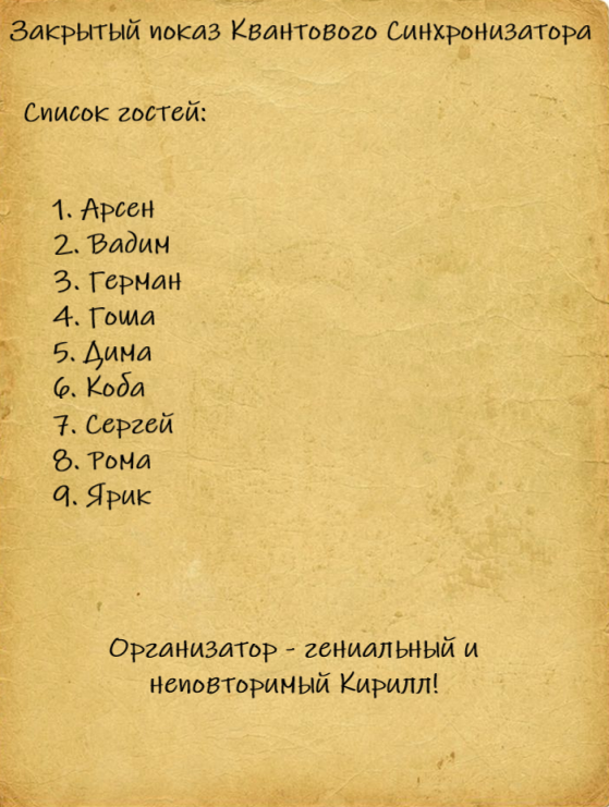 - Но перед тем, как презентовать свое творение, вы должны обозначится в списке! Все должно быть как в большой науке! — с этими словами Кирилл передал старый затёртый листок толпе.