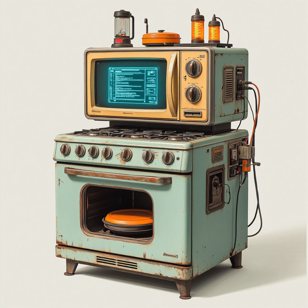 Квантовый Синхронизатор выглядел действительно… интересно. Его основой, или же корпусом выступала старая электрическая плита, в окошке которой можно было заметить круглую площадку, куда можно было что-то положить. Выше, где должны были располагаться конфорки стояла микроволновка. Крышка у нее отсутствовала, а внутри находился экран, с какой то информацией. Ну а сверху микроволновки располагались газоразрядные лампы. И все это было оплетено кабелями и проводами различной толщины.