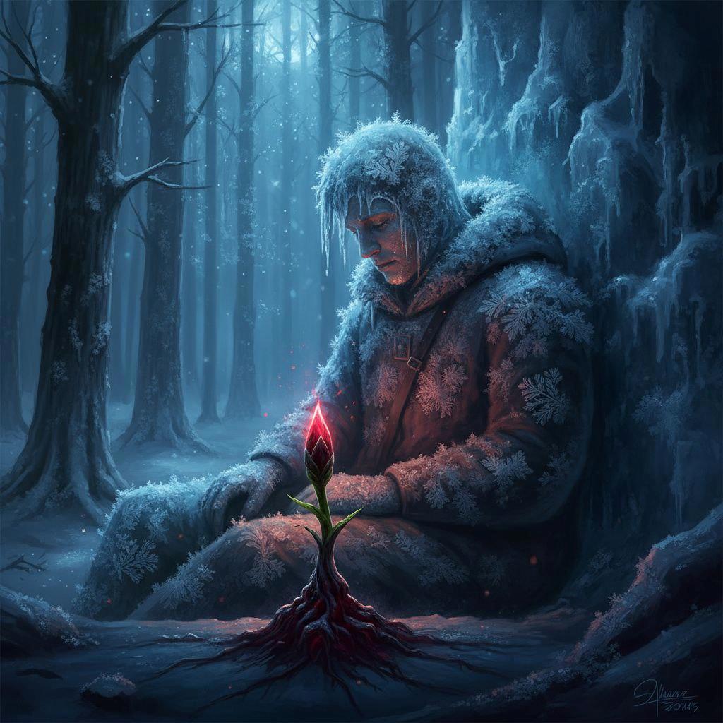 Его последний вздох был лёгким выдохом. Выдох замерз, превратившись в пушистую снежинку. Она упала прямо у основания ростка, и на миг её белизна ярко контрастировала с тёмно-красным пятном у его корней, словно последний аккорд его жертвы.