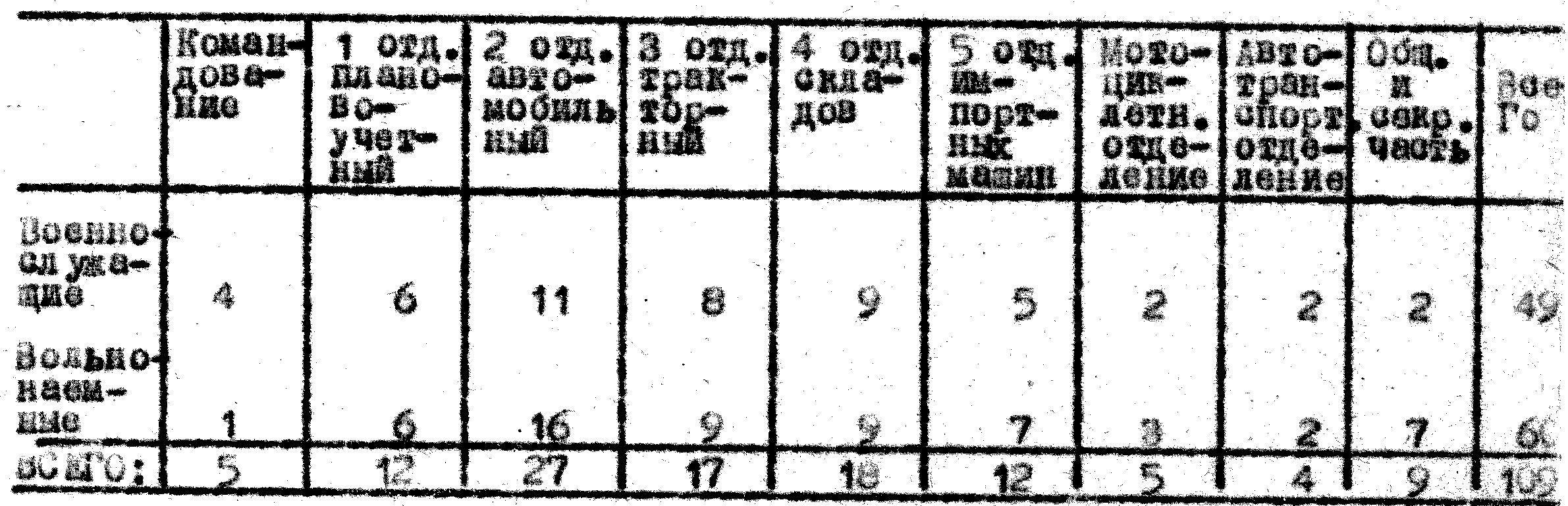Новый штат № 1/207-Г, утвержденный 3.01.42 г., предусматривал сокращение военнослужащих до 49 чел., вместо 80 по старому штату и незначительное увеличение вольнонаемного состава – 61 чел. вместо 53.