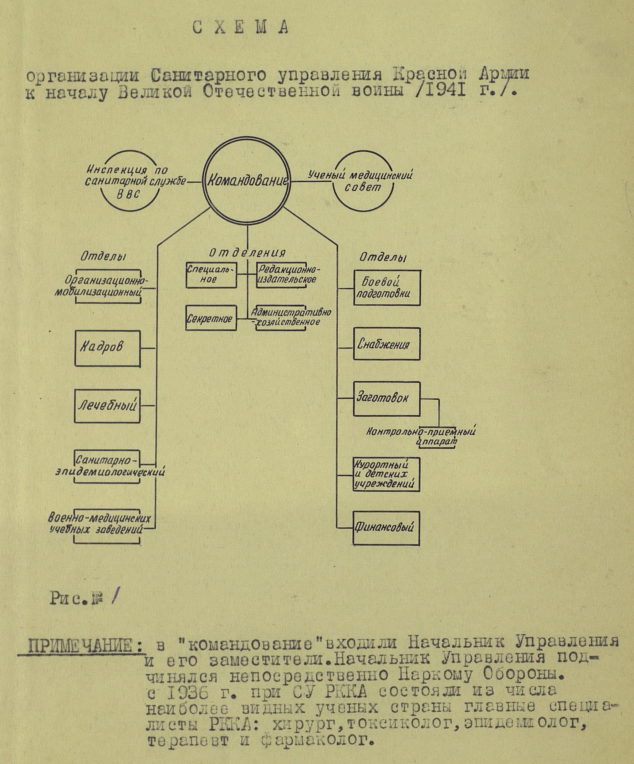 К началу Великой Отечественной войны Санитарное Управление Красной Армии (мирного времени) имело следующую структуру (рисунок № 1). С начала Великой Отечественной войны резко возросли, а также и усложнились задачи военно-медицинской службы, а, следовательно, и руководство ею. Это вызвало значительную реорганизацию: Санитарное Управление стало Главным военно-санитарным Управлением, т.е. включило в себя несколько управлений, ведающих отдельными отраслями сложного дела военно-медицинской службы.