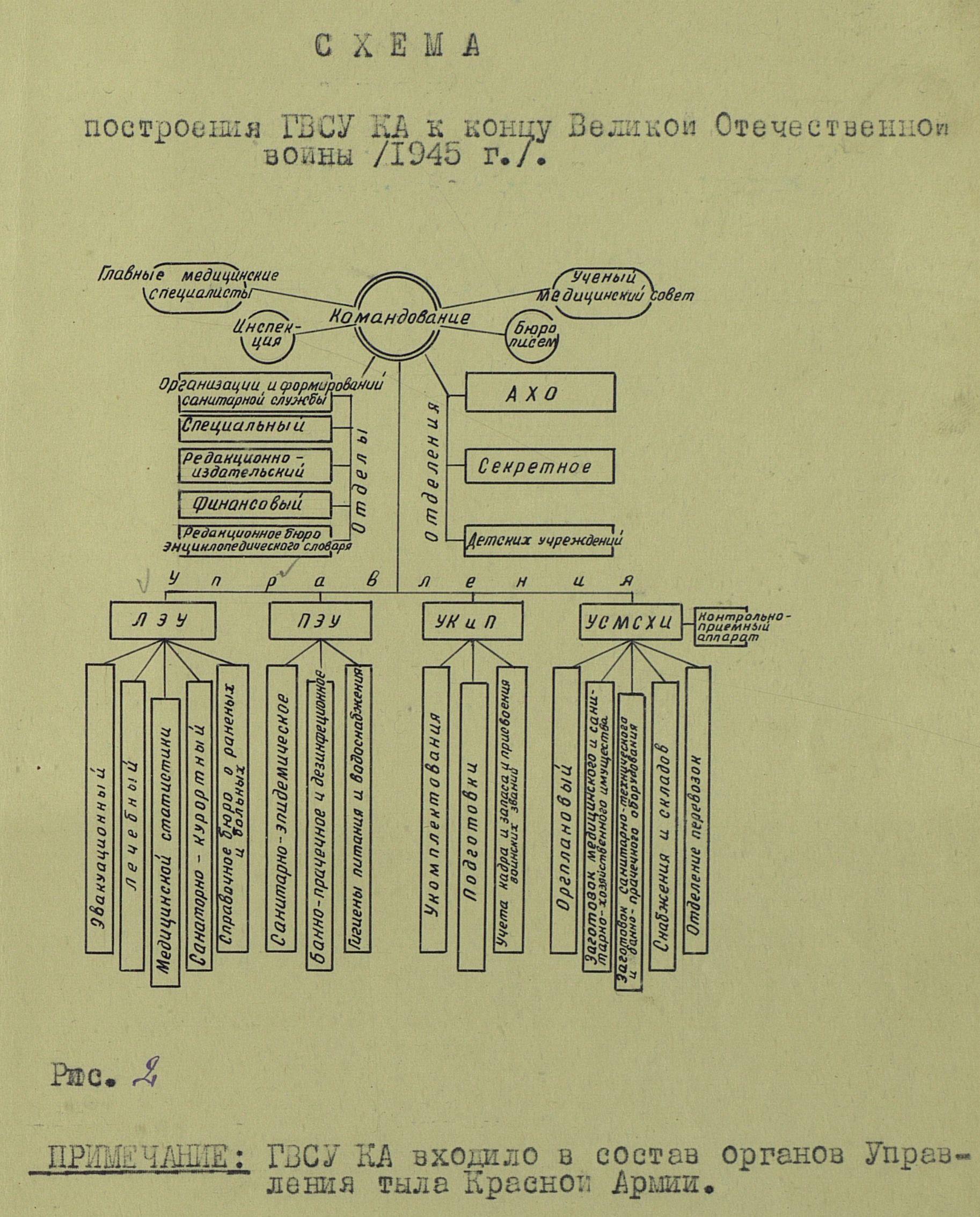 Изменение и уточнение отдельных задач, стоящих перед ГВСУ КА в ходе войны, вызвало соответствующие изменения и в структуре Главного Военно-Санитарного Управления Красной Армии. Так, например, уже в 1941 г. вместо санитарно-эпидемиологического отдела ГВСУ было добавлено 4-е управление –банно-прачечное, вскоре переименованное в противоэпидемическое; в 1942 г. было введено бюро писем; в 1943 г. в лечебно-эвакуационное управление введен санитарно-курортный отдел, в управление кадров – отдел учета кадра и запаса и присвоения воинских званий, в управление снабжения медсанхозимущества – отдел заготовок санитарной техники и банно-прачечного имущества и отделение перевозок и, наконец, в 1944 г. в ГВСУ введено Редакционное бюро по изданию энциклопедического словаря военной медицины. В итоге всех этих изменений структура Главного Военно-Санитарного Управления Красной Армии к концу Великой Отечественной войны представляется в следующем виде