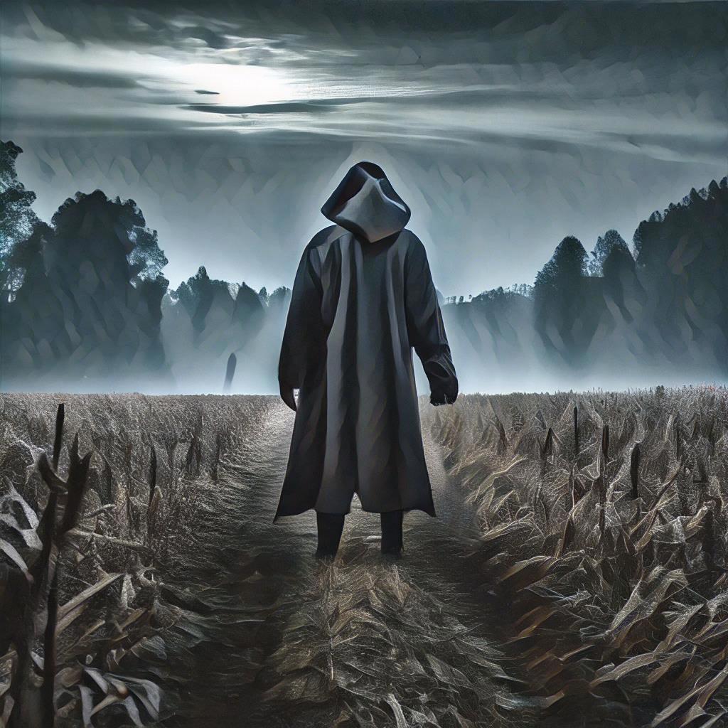 И вот , как-то раз подошёл к его кузне странный человек в совсем запылённом дорожном плаще . Лица не было видно . Голос же его звучал глухо , будто доносился из пустой бочки .