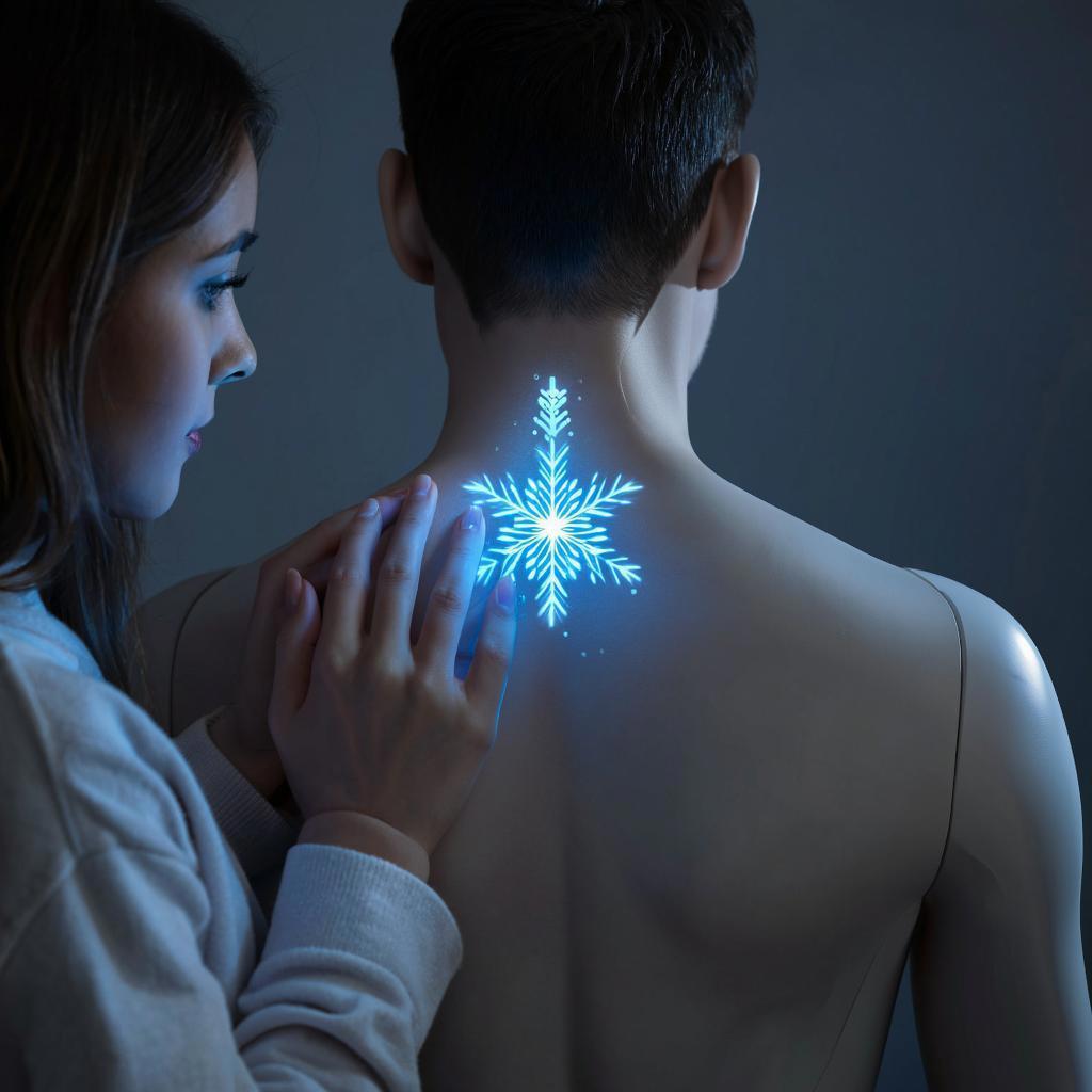 Отступаю и запрокидываю голову. Взгляд скользит по линии плеч и останавливается на линии волос. Там — изящный, сложный узор. Словно морозный кристалл, вплавленный в кожу. Клеймо. Безжалостная подпись создателей на их самом прекрасном творении.